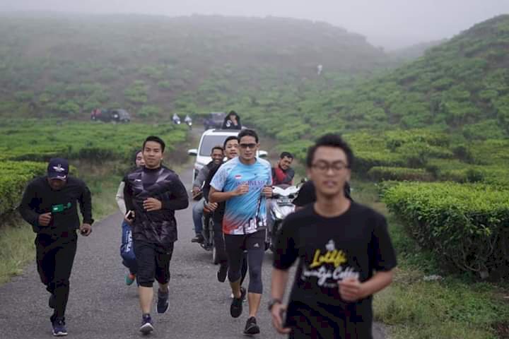 "Berlari pagi menyusuri Desa Kersik Tuo di Kabupaten Kerinci. Melewati kebun teh Kayu Aro, melihat pemandangan Gunung Kerinci yang sangat indah, ditambah dengan udara yang segar sekali. Membuat saya tidak ingin cepat-cepat pulang," kata Sandi dikutip dari laman FB nya.