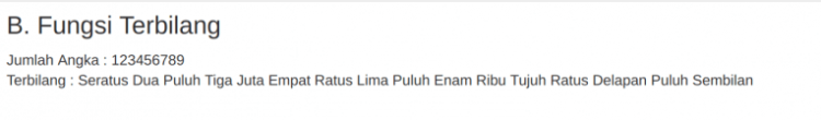 Untuk menggunakannya cukup mudah, cukup panggil fungsi ini dengan memasukkan parameter angka yang ingin di konversi menjadi terbilang. Contoh :