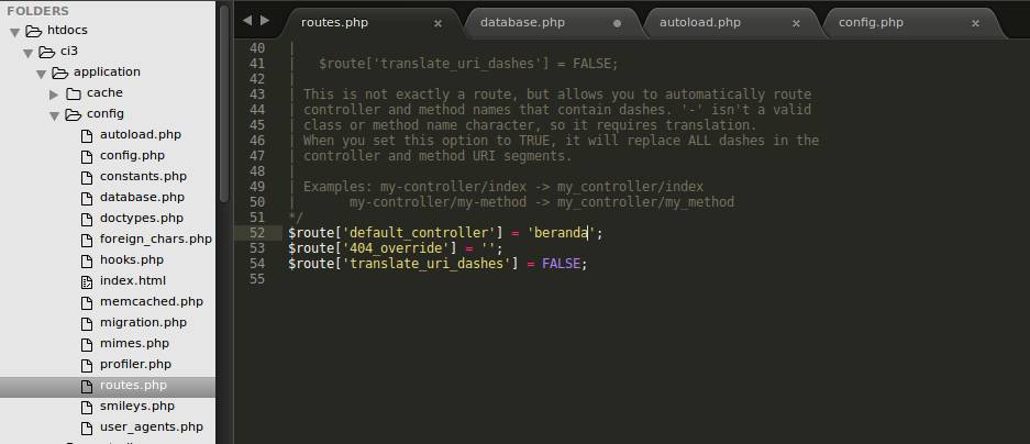 Yang terakhir, buka file routes.php. Iya, iya kamu bener. Itu masih di direktori application/config/ :D