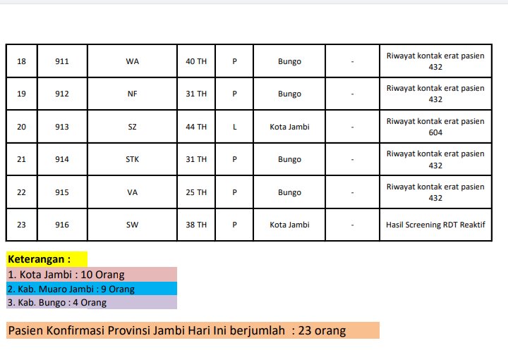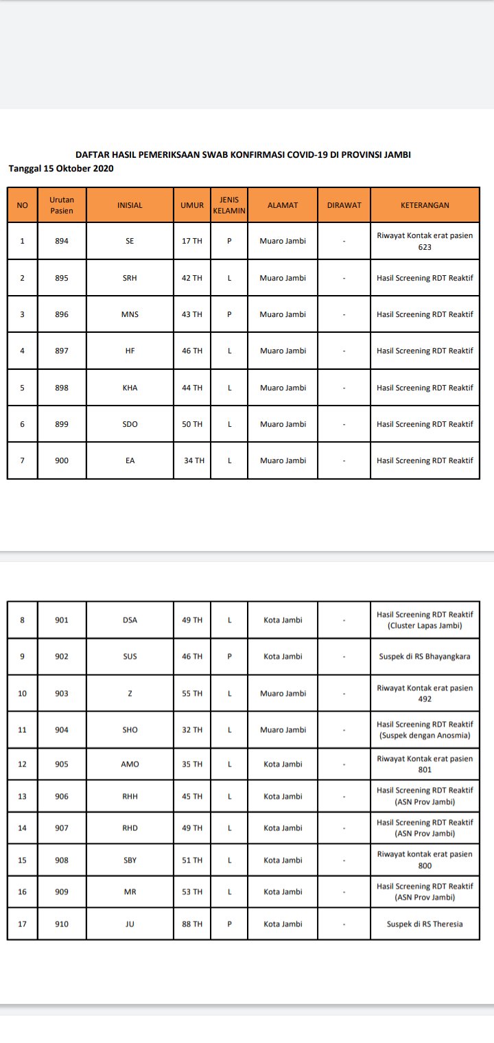 Insial JU 88 tahun perempuan asal Kota Jambi riwayat suspek rumah sakit Theresia. WA 40 tahun perempuan asal Kabupaten Bungo riwayat pasien 432. NF 31 tahun perempuan asal Kabupaten Bungo riwayat pasien 432. SZ 44 tahun laki-laki asal Kota Jambi riwayat pasien 604.