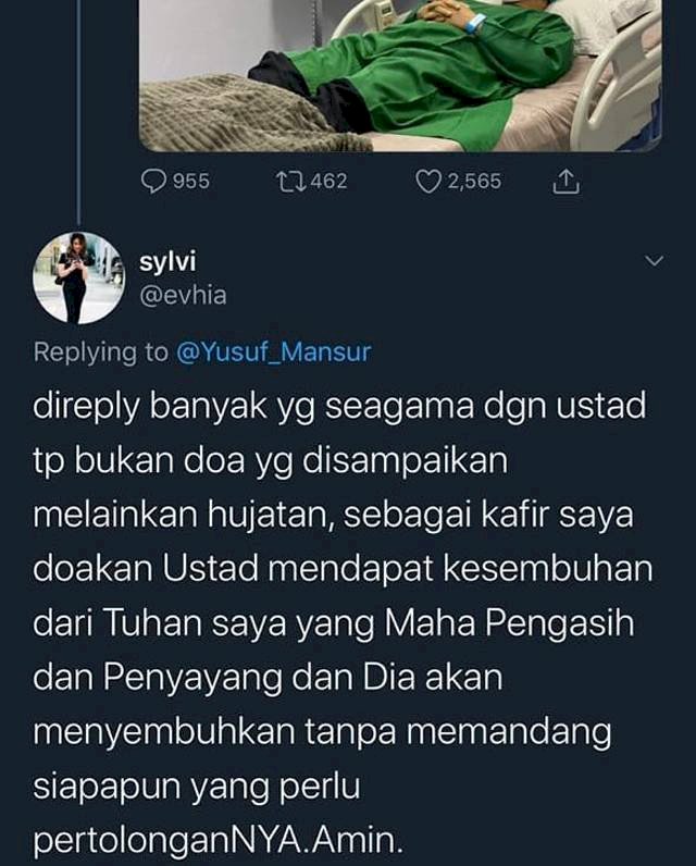 “Direply banyak yang seagama dengan ustad tapi bukan doa yang disampaikan melainkan hujatan. Sebagai kafir saya doakan Ustad mendapat kesembuhan dari Tuhan saya yang maha pengasih dan penyayang dan Dia akan menyembuhkan tanpa memandang siapapun yang perlu pertolonganNya, amin,” tulis Sylvi dengan akun @evhia.