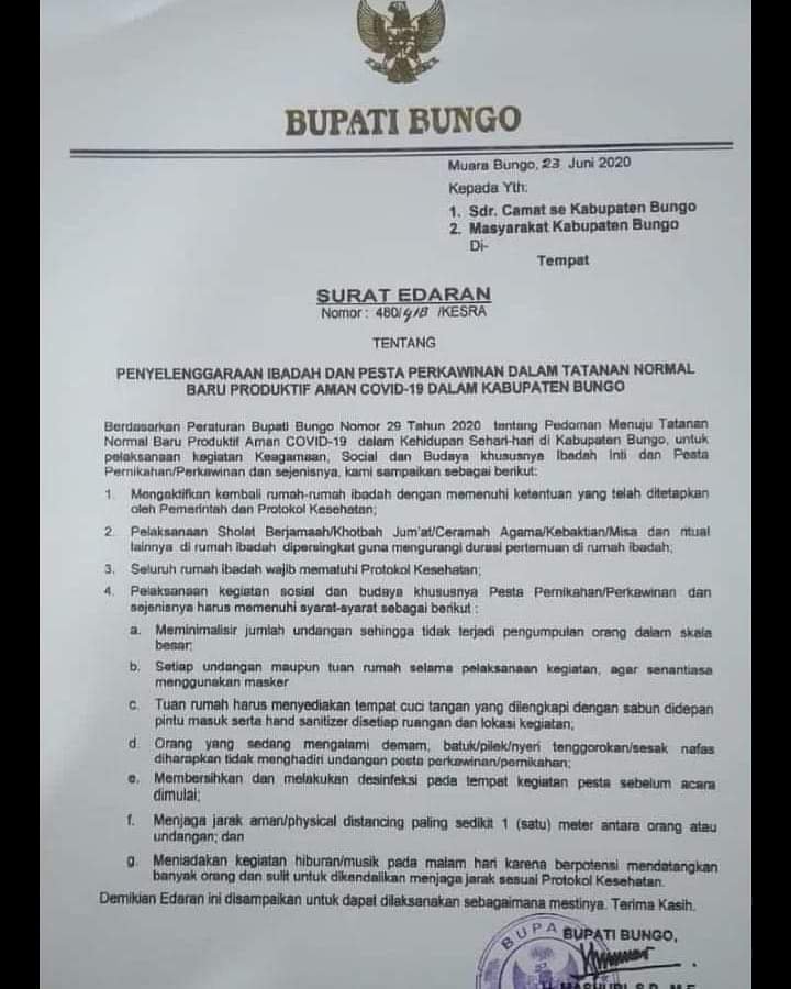 Normal Baru, Bupati Bungo Terbitkan Surat Edaran Perbolehkan Pesta Pernikahan & Ibadah
