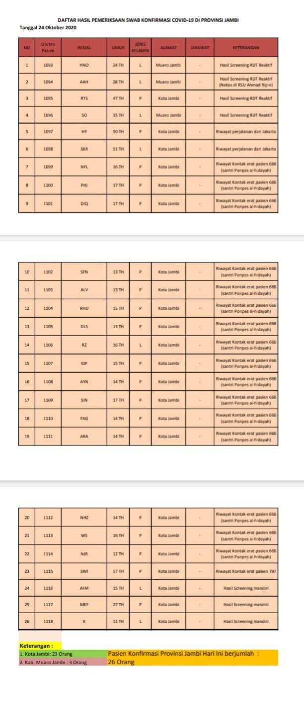 Diketahui hari ini ada 26 pasien yang terkonfirmasi positif Corona yang berasal dari Muarojambi dan Kota Jambi.
