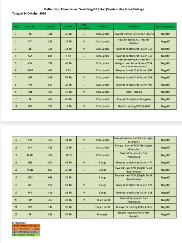 BRITO.ID, BERITA JAMBI - Tim Satgas Penanganan Covid-19 Provinsi Jambi kembali merilis perkembangan virus Corona di 11 Kabupaten Kota hari ini, Sabtu (24/10/2020).