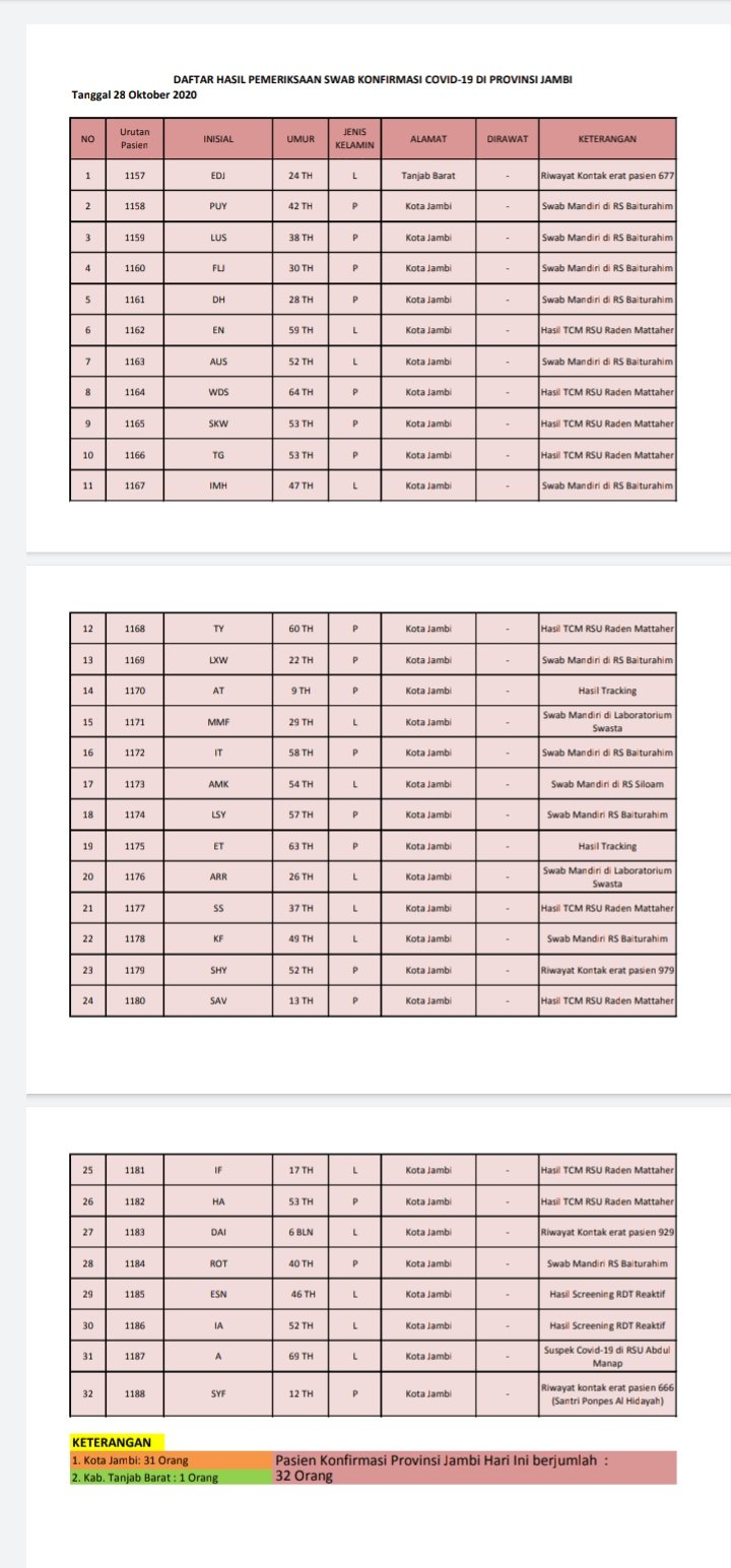 Dari sebaran data tersebut, terjadi penambahan pasien positif sebanyak 32 orang. Dan yang lebih mengejutkan, dari 32 orang tersebut, 31 orang berasal dari Kota Jambi, dan 1 pasien berasal dari Tanjab Barat.