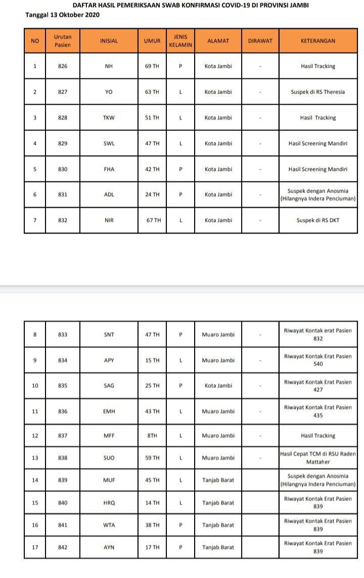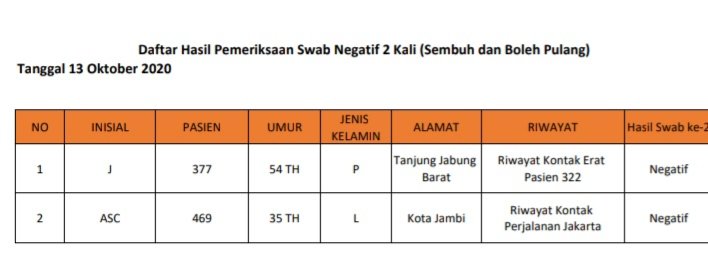 Selain penambahan pasien positif, pasien sembuh juga bertambah sebanyak 2 orang hari ini, yang berasal dari Kota Jambi dan Tanjab Barat.