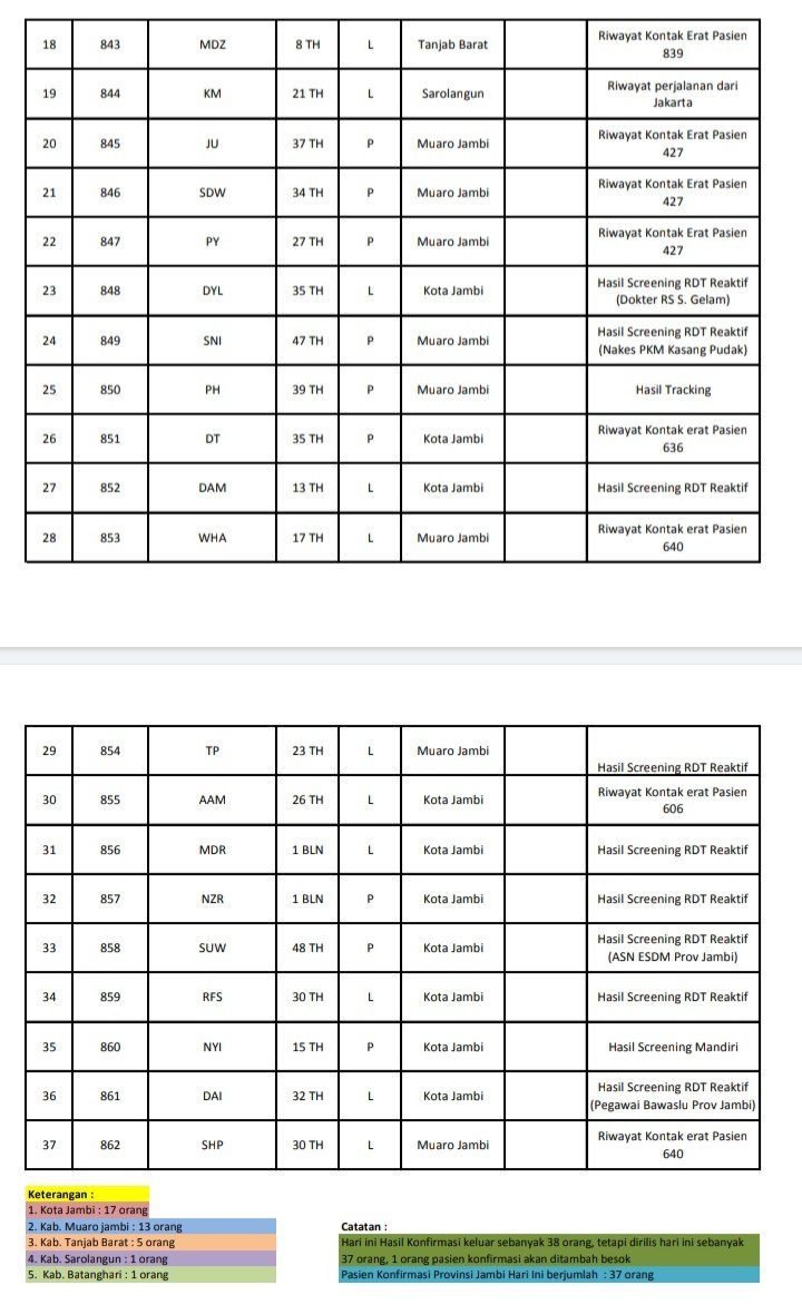 Informasi yang didapat, dari 37 penambahan pasien positif hari ini, terdapat 1 ASN di Dinas ESDM Provinsi Jambi, dan 1 Dokter yang bertugas di salah satu Rumah Sakit Kota Jambi.