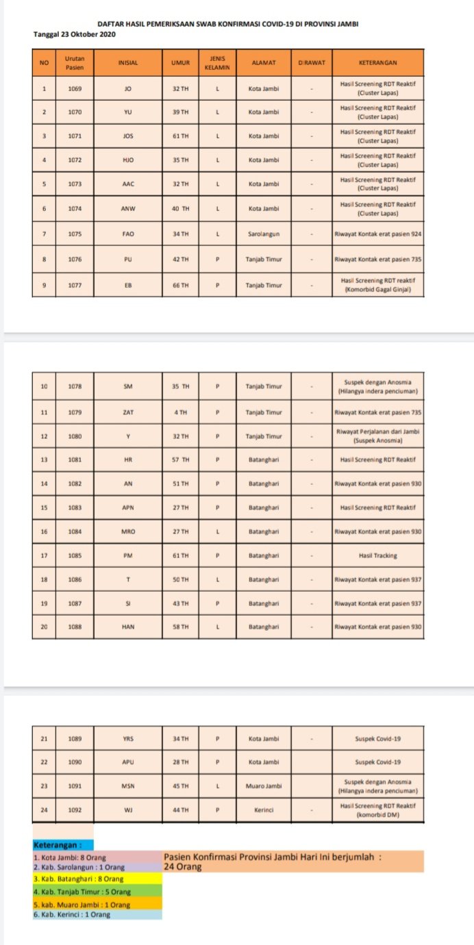 BRITO.ID, BERITA JAMBI - Pasien positif Corona di Jambi terus bertambah. Hari ini, Jum'at (23/10/2020) pasien positif bertambah sebanyak 24 orang.