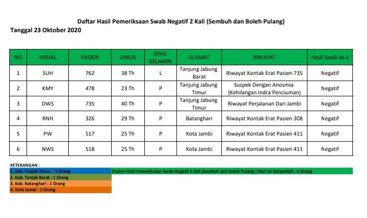 Pasien positif Corona di Jambi terus bertambah. Hari ini, Jum'at (23/10/2020) pasien positif bertambah sebanyak 24 orang.