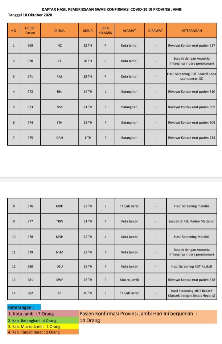 Informasi yang didapat, dari Satgas Penanganan Covid-19 Provinsi Jambi, penambahan 14 pasien positif ini terjadi di Kota Jambi 7 Orang, Batanghari 4 orang, Muarojambi 1 orang dan Tanjab Barat 2 orang.