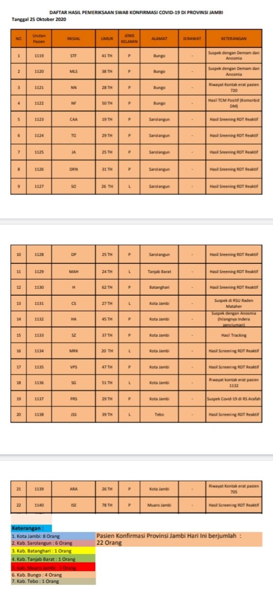 Dilansir dari Satgas Penanganan Covid-19 Provinsi Jambi, 54 pasien sembuh ini berasal dari Muarojambi, Tanjab Barat, Kota Jambi dan Merangin.