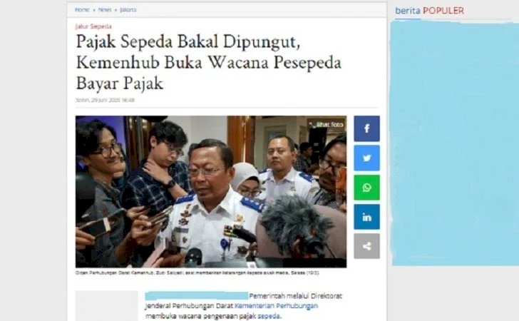Salah satu media nasional mengunggah berita berjudul "Pajak Sepeda Bakal Dipungut, Kemenhub Buka Wacana Pesepeda Bayar Pajak", pada Senin (29/6).