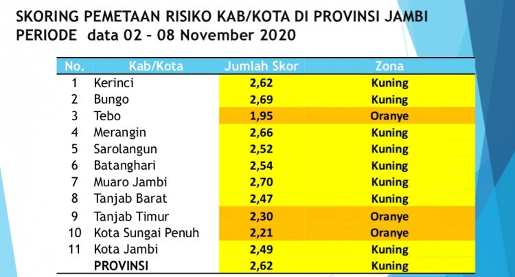 Satuan Tugas (Satgas) Penanganan Covid-19 Provinsi Jambi memperbaharui peta risiko wilayah penyebaran Covid-19. Dari skoring pemetaan periode 2-8 November 2020 di Provinsi Jambi, ada tiga Kabupaten yang masih berada di zona orange.