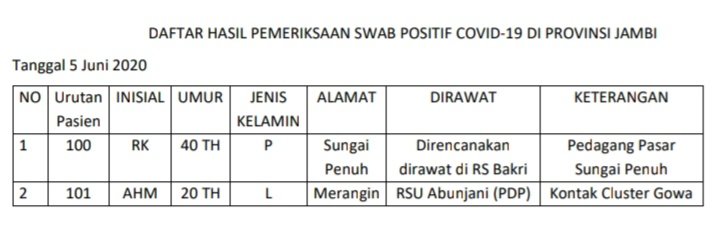 Jubir Covid-19 Provinsi Jambi, Johansyah, yang dikonfirmasi membenarkan hal tersebut, dan mengatakan pasien penambahan ini berasal dari Merangin dan Sungaipenuh.
