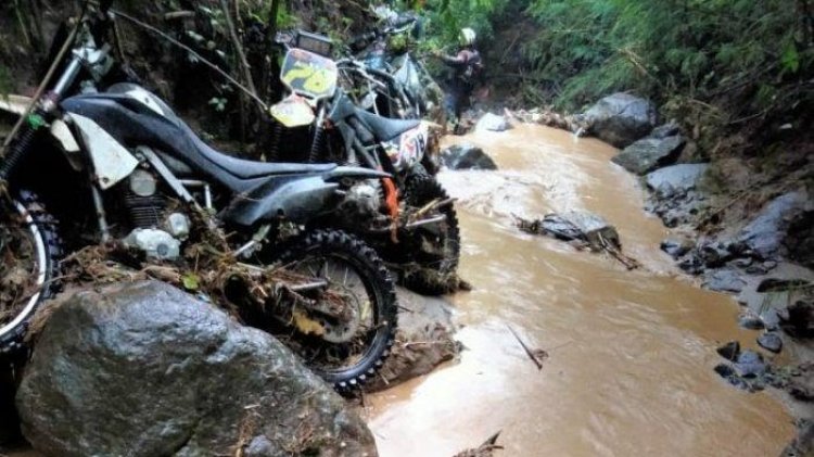 Pasalnya, sepeda motor trail mereka tersapu arus deras banjir bandang sungai yang mereka lewati. Sebanyak 3 orang sempat terseret arus tersebut dan mengalami luka ringan.