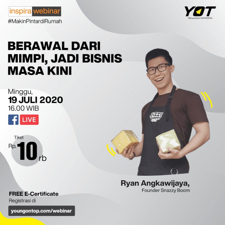 Yuk dengerin dan tanya langsung seputar cerita Ryan dalam mendirikan Snazzy Boom di Inspira Webinar ‘Berawal dari Mimpi, Jadi Bisnis Masa Kini‘ hari Minggu, 19 Juli 2020 pukul 16.00 WIB. Ini dia detail acaranya: