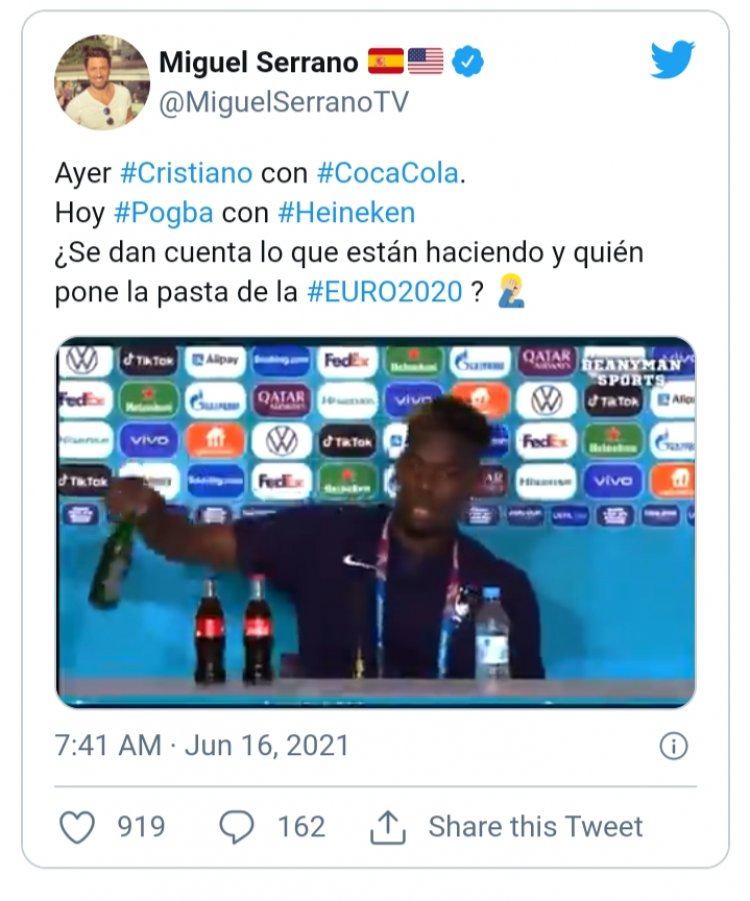 Ia kemudian menyoroti tindakan yang dilakukan oleh Cristiano Ronaldo yang saat itu menggeser minuman bersoda Coca-Cola.