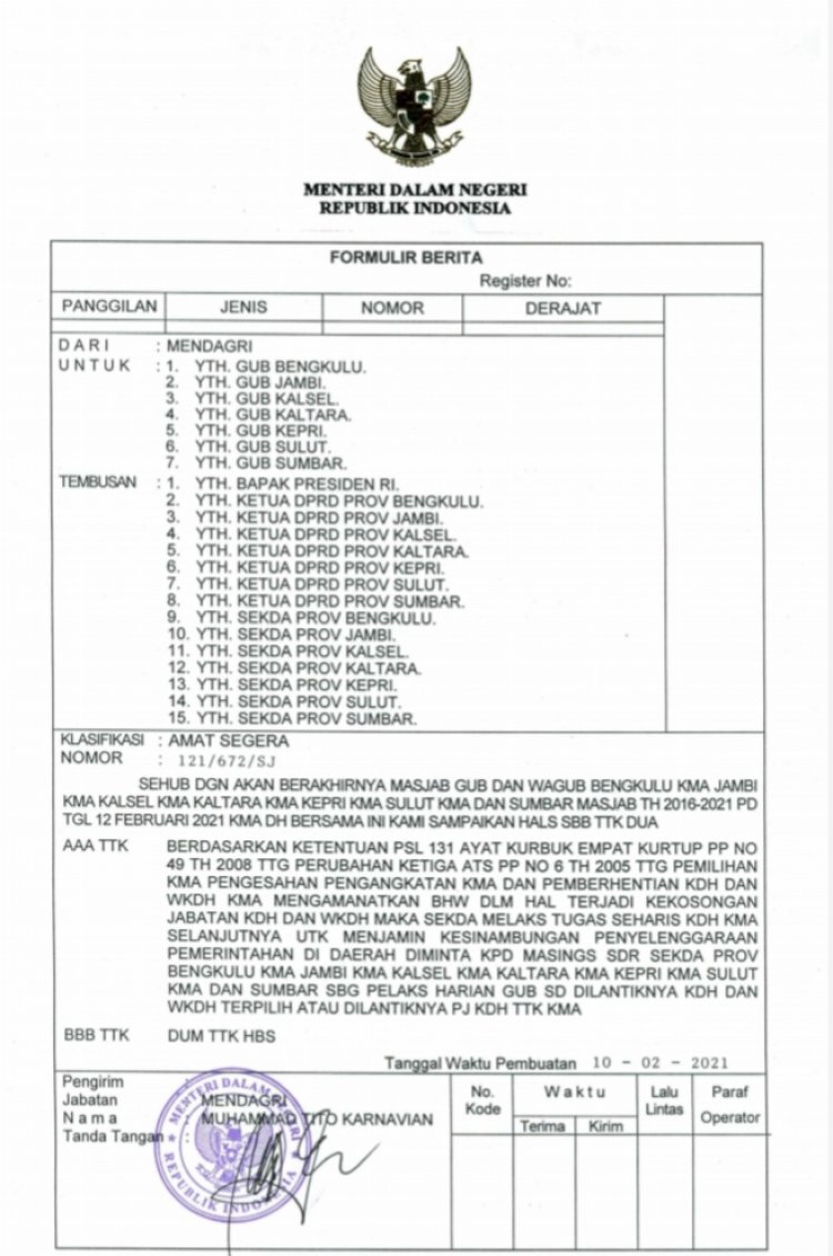 Penunjukan ini berdasarkan radiogram nomor 121/672/SJ tertanggal 10 Februari 2021 tersebut ditembuskan kepada 7 Sekdaprov yang daerahnya melaksanakan Pilgub di Indonesia dengan klasifikasi amat segera.