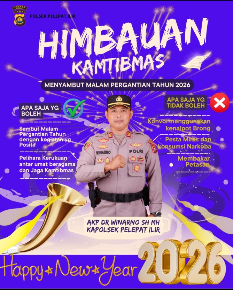 BRITO.ID, BERITA BUNGO – Menyambut malam pergantian Tahun Baru 2026, Kapolsek Pelepat Ilir AKP Dr. Winarno, SH, MH, mengimbau seluruh masyarakat untuk merayakan momentum tersebut dengan cara yang positif, aman, dan tetap menjaga ketertiban umum.