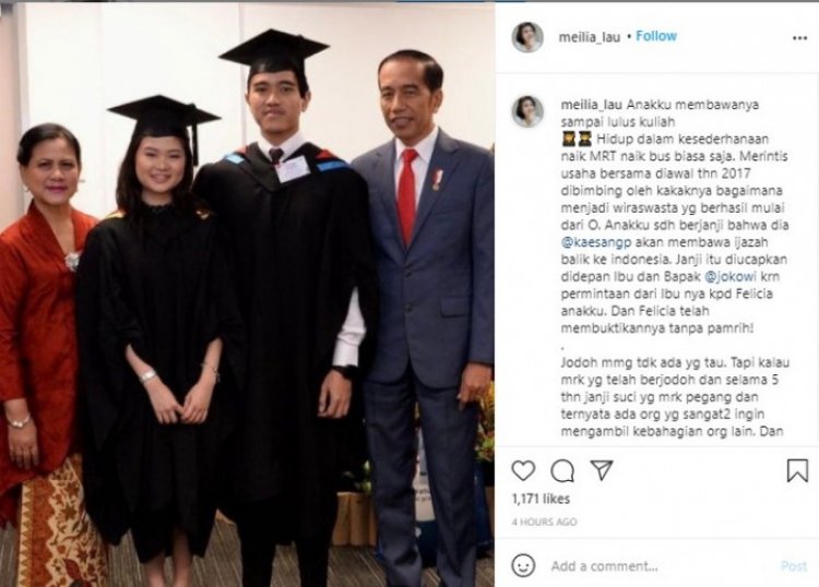 "Anakku membawanya sampai lulus kuliah. Hidup dalam kesederhanaan naik MRT naik bus biasa saja. Merintis usaha bersama diawal thn 2017 dibimbing oleh kakaknya bagaimana menjadi wiraswasta yg berhasil mulai dari O. Anakku sdh berjanji bahwa dia @kaesangp akan membawa ijazah balik ke indonesia. Janji itu diucapkan didepan Ibu dan Bapak @jokowi krn permintaan dari Ibu nya kpd Felicia anakku. Dan Felicia telah membuktikannya tanpa pamrih!" tulis Meilia Liu di caption foto yang menampilkan foto Felicya dan Kaesang saat momen wisuda didampingi Presiden Jokowi dan Iriana.