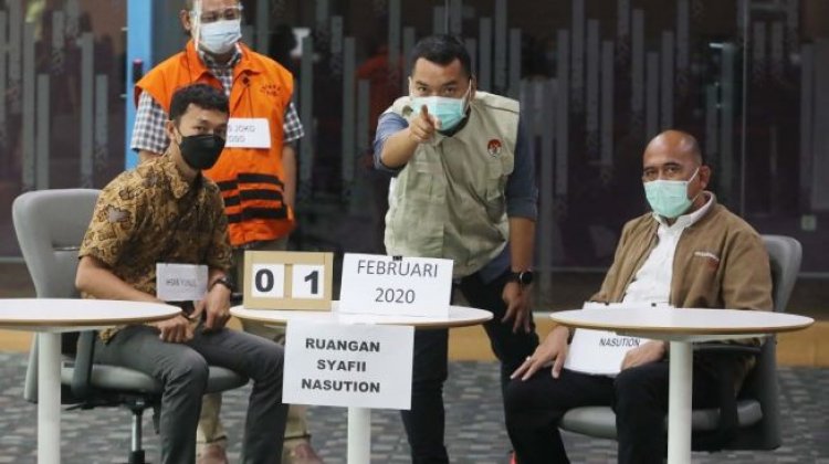 Penyidik KPK Praswad Nugraha (tangan menunjuk) saat rekonstruksi kasus korupsi Bansos Covid-19. [ISTIMEWA]