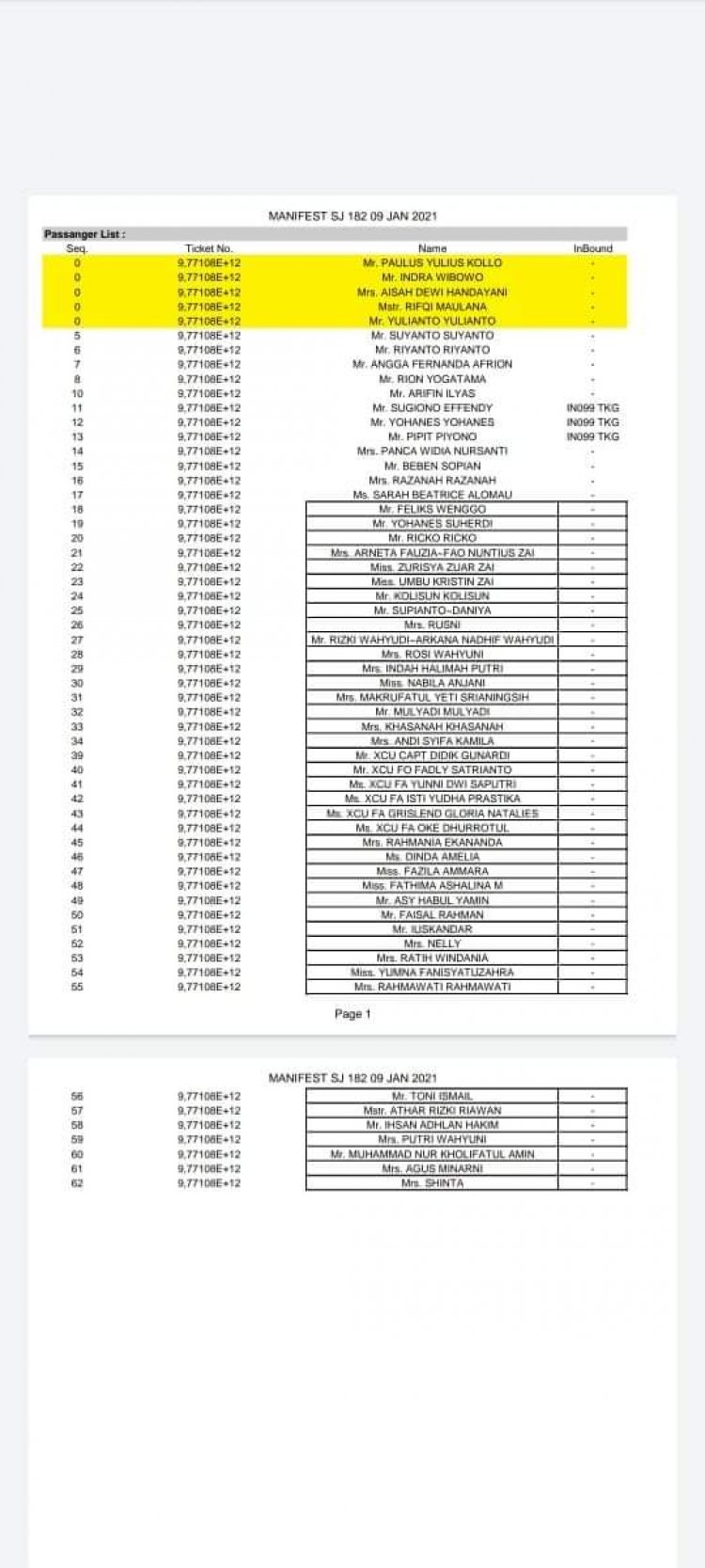 Berikut Manifest lengkap penumpang Pesawat Sriwijaya Air SJY182: