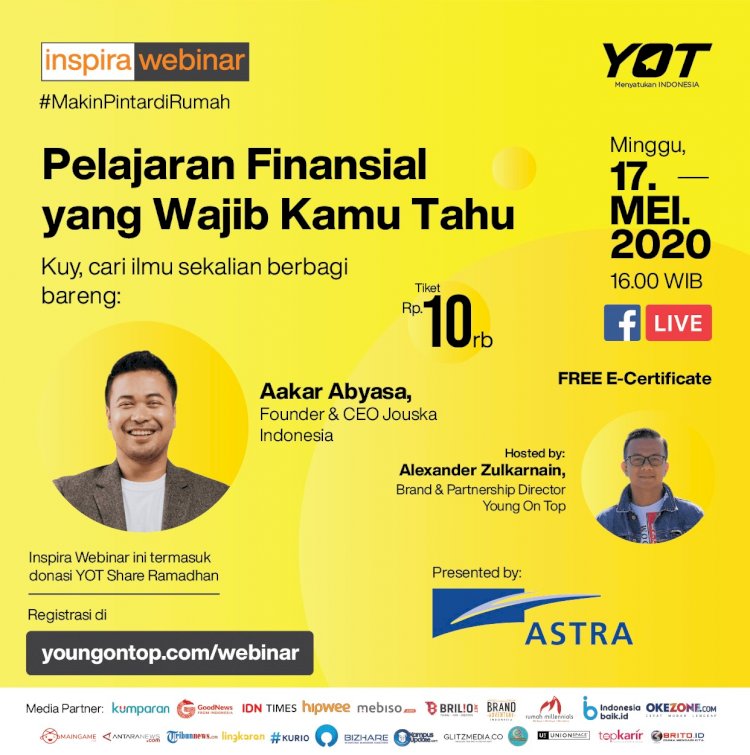 Emangnya pelajaran finansial apa aja sih yang wajib kita tau? Yuk belajar sama ahlinya di Inspira Webinar #MakinPintardiRumah presented by Astra: ‘Pelajaran Finansial yang Wajib Kamu Tahu’ bareng Aakar Abyasa, Founder & CEO Jouska Indonesia, hari Minggu, 17 Mei 2020, pukul 16.00 WIB. Ini dia detail acaranya: