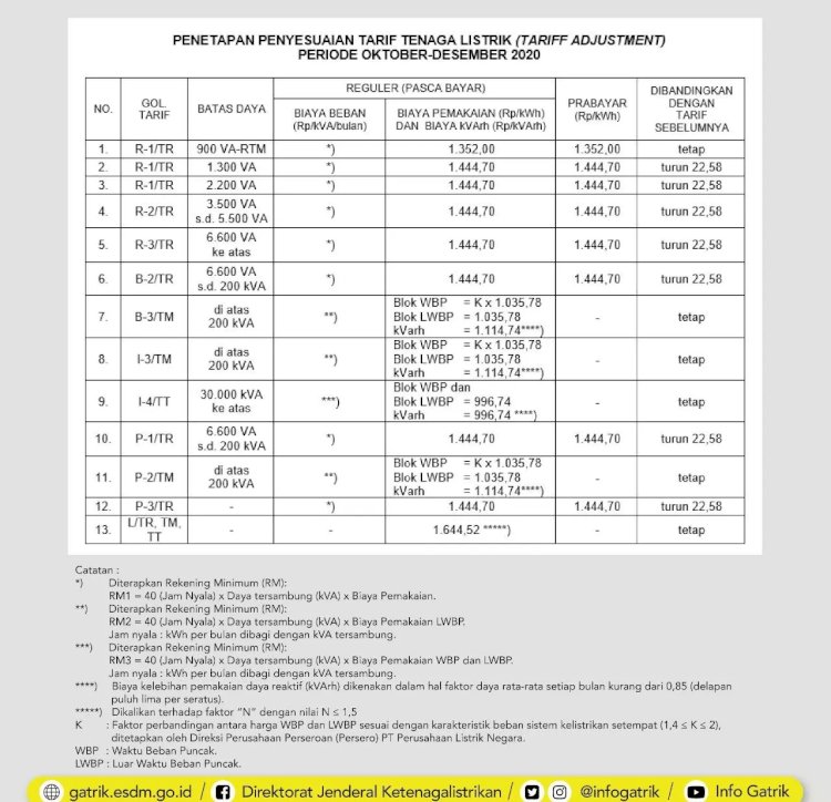 Kepala Biro Komunikasi, Layanan Informasi Publik, dan Kerja Sama (KLIK) Kementerian ESDM Agung Pribadi dalam laman Kementerian ESDM yang dikutip di Jakarta, Sabtu, mengatakan penurunan tarif listrik itu sesuai arahan Menteri ESDM Arifin Tasrif kepada Direktur Utama PLN melalui Surat No 291/23/MEM.L/2020 terkait penurunan tariff adjustment untuk pelanggan golongan tegangan rendah terhitung per 1 Oktober 2020.