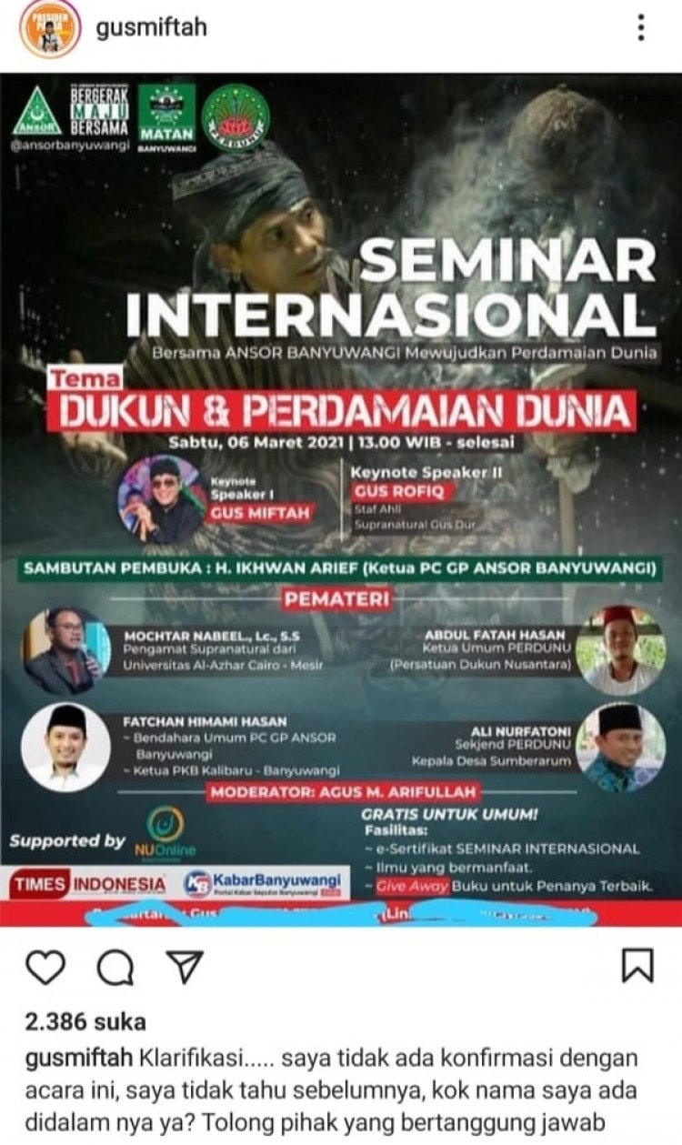 Gus Miftah protes dan meminta klarifikasi karena namanya dicatut dalam Seminar Internasional bertemakan Dukun dan Perdamaian Dunia di Banyuwangi. Bahkan Gus Miftah menegaskan bakal menolak mengisi kegiatan tersebut.