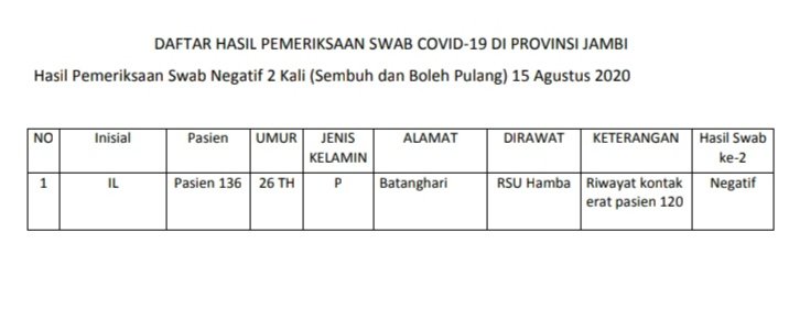 "Pasien sembuh bertambah 1 orang juga dari kabupaten Batanghari hingga total ada 121 pasien sembuh di Jambi," kata dia.