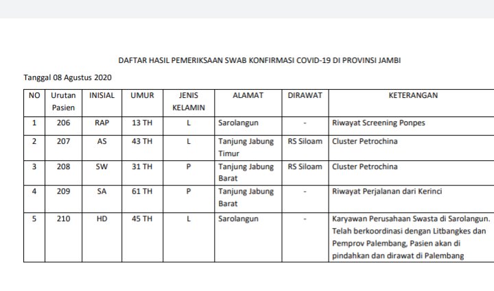 "Iya, terjadi penambahan 5 orang pasien terkonfirmasi positif COVID-19 di Jambi hingga total perhari ini ada 210 kasus konfirm di Jambi," kata Jubir Tim Gugus Tugas Penanganan COVID-19 Jambi Johansyah, Sabtu (8/8/2020).