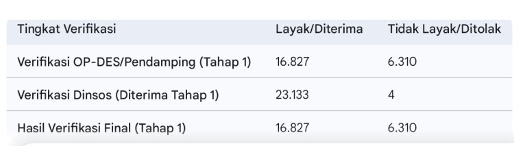 Angka ini menunjukkan adanya disparitas data antara verifikasi Dinsos dan Hasil Verifikasi Final/OP-DES, yang mungkin mengindikasikan proses filtering atau validasi di berbagai tahapan.
