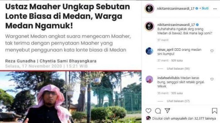 "Buahahaha, ngakak. Sekarang orang Medan mau dibawa-bawa. Besok mana lagi Son?" tulis Nikita Mirzani, Kamis (19/11/2020).
