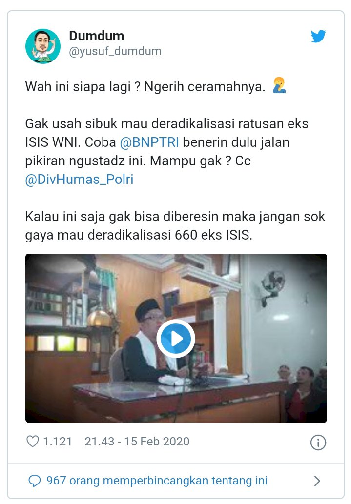 Bahkan dalam isi ceramahnya, pemuka agama tersebut menilai rezim saat ini komunis. Dia mengatakan itu ‘secara sadar’ di depan orang-orang yang mendengarkan ceramahnya. Klaim itu disampaikan lewat video yang dibagikan oleh pengguna Twitter @yusuf_dumdum, dikutip indopolitika.com, Minggu, (16/2/2020).