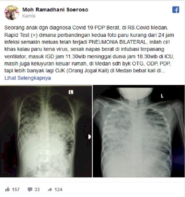 "Seorang anak dgn diagnosa Covid 19 PDP Berat,di RS.Covid Medan, dimana perbandingan kedua foto paru kurang dari 24 jam telah terjadi pneumonia bilateral, inilah ciri khas kl paru kena virus, sesak napas berat di intubasi terpasang ventilator, masuk IGD jam 11.30wib meninggal dunia jam 18.30wib di ICU, masih juga keluyuran keluar rumah, di Medan sdh byk OTG, ODP, PDP, tapi Lebih banyak lagi OJK (Orang Jogal Kali) Di Medan bebal Kali disuruh "stay at home" malah keluar"...