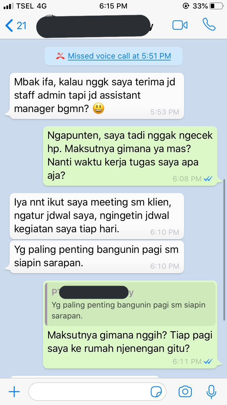 Dalam tangkapan layar percakapan WhatsApp tersebut, pemilik perusahaan justru menghubungi Ifa untuk melamarnya.
