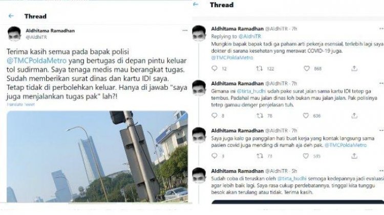 "Terima kasih semua pada bapak polisi @TMCPoldaMetro yang bertugas di depan pintu keluar tol sudirman. Saya tenaga medis mau berangkat tugas. Sudah memberikan surat dinas dan kartu IDI saya. Tetap tidak di perbolehkan keluar. Hanya di jawab "saya juga menjalankan tugas pak" lah?!" tulis akun @AldhiTR.