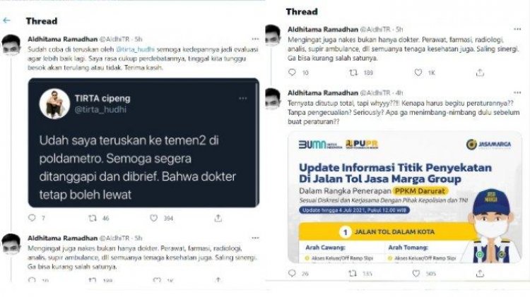 Dalam cuitannya, akun @AldhiTR mengaku tak diizinkan lewat saat berada di pintu keluar Tol Sudirman, Jakarta. Padahal, pria yang berprofesi sebagai dokter ini bermaksud untuk bertugas di sebuah rumah sakit.