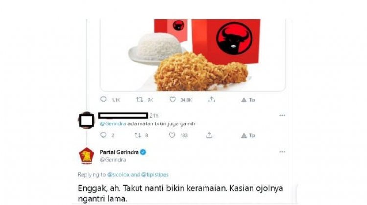 Sontak, sang admin akun Twitter Partai Gerindra lantas menjawab pertanyaan tersebut dengan gamblang. Sang admin mengaku tidak tertarik karena dapat berisiko menyebabkan keramaian dan membuat driver ojol mengantre lama.