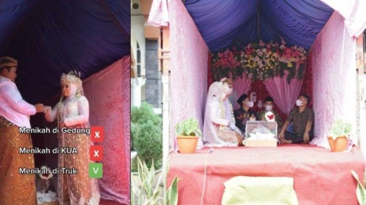 Viral di media sosial, video sepasang pengantin gelar akad nikah di dalam bak truk, ini sosok dan cerita dibaliknya. (TikTok @deniassusanto, Istimewa)