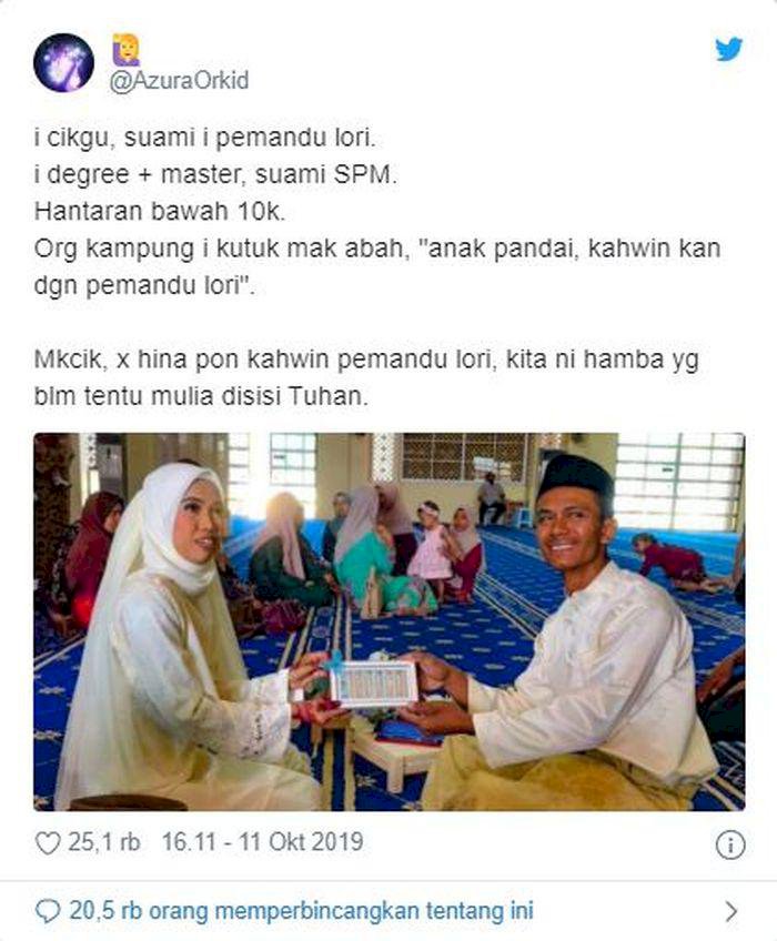 "Bahkan saat resepsi, ada tetangga yang tanya ke ayah dan ibu saya, kenapa saya yang punya gelar master tapi mau dinikahi dengan supir truk. Tak pantas lah kata mereka," ungkapnya seperti yang dilansir dari laman Says.