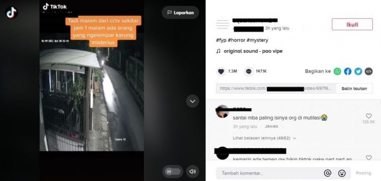 Sebuah video yang menunjukkan misteri isi karung baru-baru ini menjadi viral di media sosial. Bagaimana tidak, karung itu dilempar ke sebuah rumah pada pukul 01.00 WIB sehingga membuat ngeri sang pemilik rumah. Video ini dibagikan oleh akun TikTok @aqu******om24 pada Kamis (10/5/2021). Hingga berita ini dibuat, tayangan itu telah disaksikan lebih dari 18 juta kali dan mendapatkan 1,3 juta tanda like.