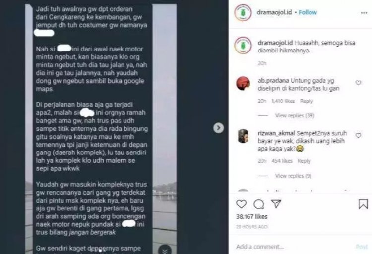 Pada unggahan itu, ia menulis sebuah caption yang mengatakan bahwa peristiwa ini bisa jadi pelajaran bagi para driver ojol lainnya, dikutip dari Hops.id---Jaringan Suara.com, Rabu (2/12/2020).