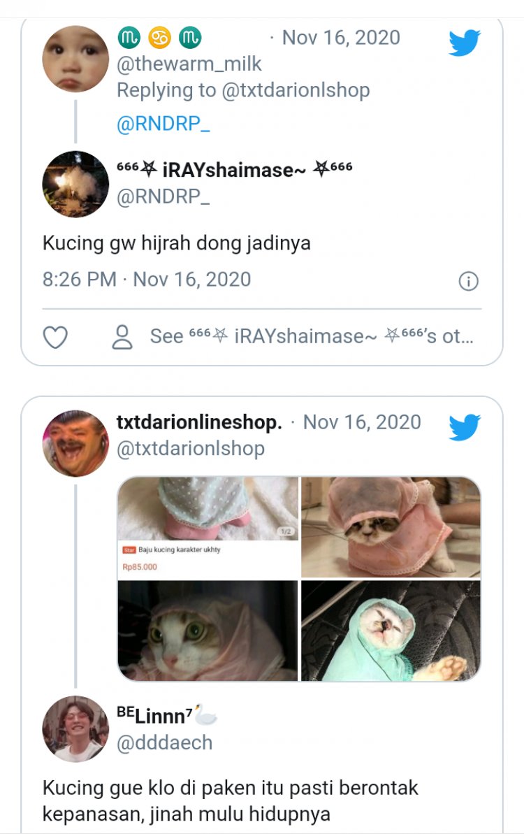 Melalui akun Twitter @txtonlineshop, pemilik akun tersebut mengunggah foto baju dan hijab satu set untuk seekor kucing. Produk yang dijual dengan nama ‘baju kucing karakter ukhti’ tersebut dibanderol seharga Rp85.000 per pakaian.