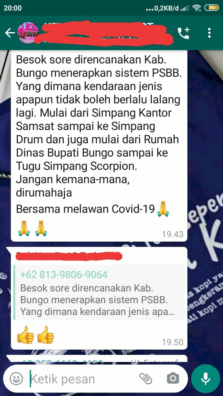 Seperti yang dilihat di salah satu grup di Bungo. Seperti dibawah ini pesan berantai soal PSBB:
