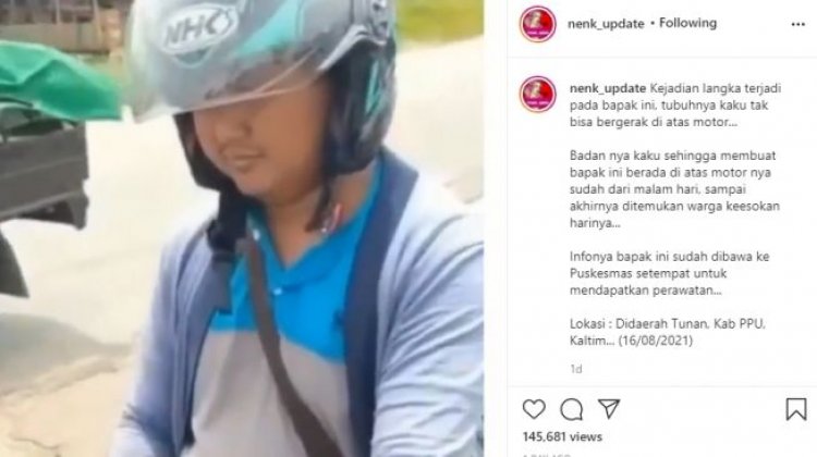 Viral kejadian tak biasa beredar di media sosial. Video yang memperlihatkan seorang pria yang duduk di atas motor. Tubuh pria ini kaku dan tak bisa bergerak. Bahkan, pria tersebut sampai tak bisa berbicara. Video kejadian itu dibagikan oleh akun Instagram @nenk_update, Rabu (19/8/2021).