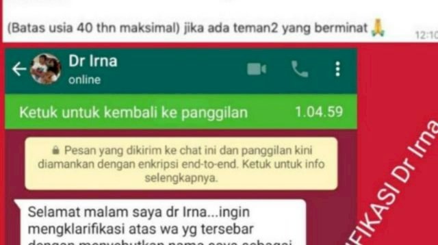 Ada pula unggahan di media sosial, Dokter Irna– yang dicatut namanya–telah memberikan klarifikasi bahwa informasi tersebut adalah salah. Jika menerima pesan tersebut, Dokter Irna meminta masyarakat untuk mengabaikannya. Berikut klarifikasinya: