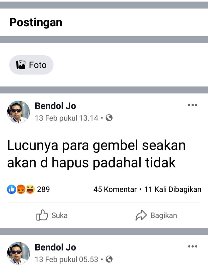 Dilihat Brito.id di laman Facebook pribadinya Bendol Jo sempat memposting perlawanan terhadap netizen yang geram dengannya.