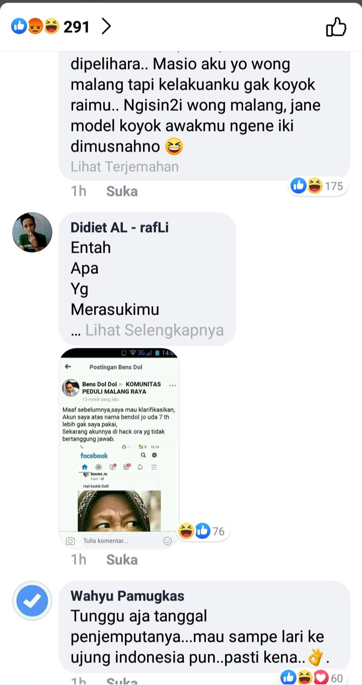 "Maaf sebelumnya,saya mau klarifikasikan, akun saya atas nama Bendol Jo Uda 7th lebih gak saya pakai. Sekarang akunnya di hack ora yg tidak bertanggung jawab," tulis akun Bens Dol Dol yang menyertakan postingan Bendol Jo di grup Komunitas Peduli Malang Raya, Jumat (13/1).