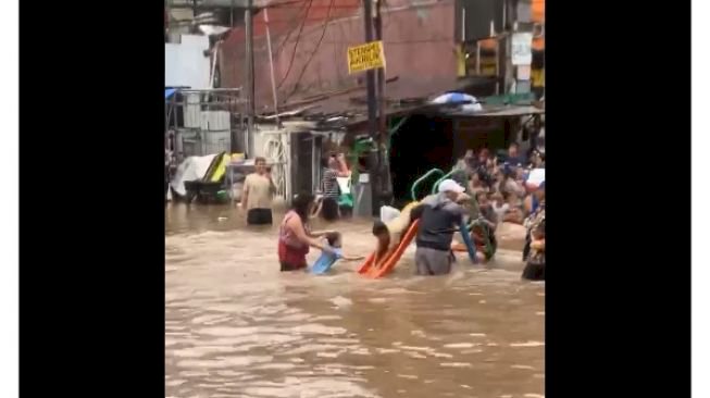 Viral lainnya menunjukkan anak-anak bermain perosotan di tengah banjir. Banjir setinggi pinggang orang dewasa pun terasa seperti kolam renang di taman bermain air.